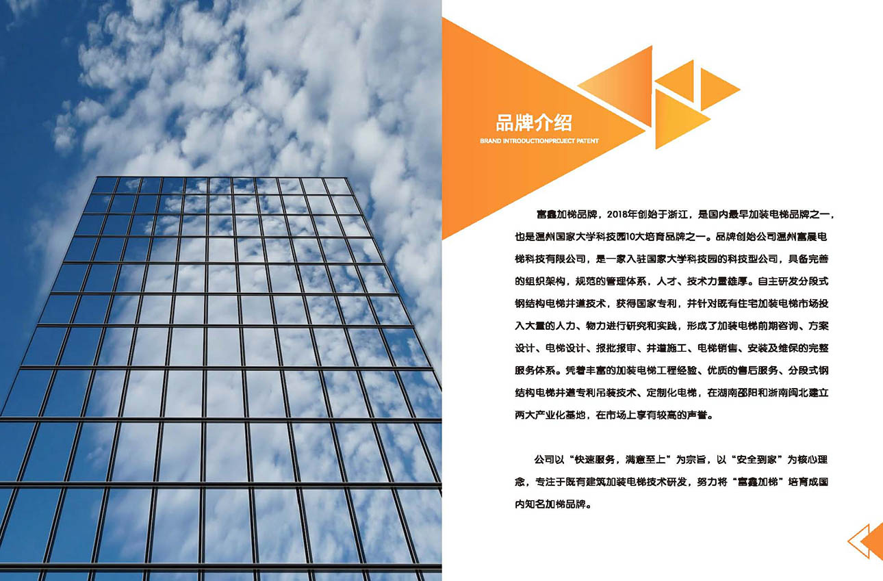 富鑫加梯品牌,2018年创始于浙江,是国内最早加装电梯品牌之一,也是温州国家大学科技园10大培育品牌之一。品牌创始公司温州富晨电梯科技有限公司,是一家入驻国家大学科技园的科技型公司,具备完善的组织架构,规范的管理体系,人才、技术力量雄厚。自主研发分段式钢结构电梯井道技术,获得国家专利,并针对既有住宅加装电梯市场投入大量的人力、物力进行研究和实践,形成了加装电梯前期咨询、方案设计、电梯设计、报批报审、井道施工、电梯销售、安装及维保的完整服务体系。凭着丰富的加装电梯工程经验、优质的售后服务、分段式钢结构电梯井道专利吊装技术、定制化电梯,在湖南邵阳和浙南闽北建立两大产业化基地,在市场上享有较高的声誉。