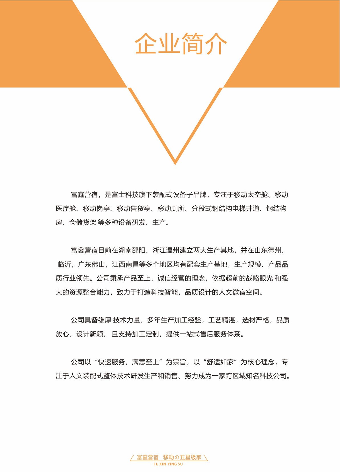 富鑫营宿,是富士科技旗下装配式设备子品牌,专注于移动太空舱、移动医疗舱、移动岗亭、移动售货亭、移动厕所、分段式钢结构电梯井道、钢结构房、仓储货架 等多种设备研发、生产。